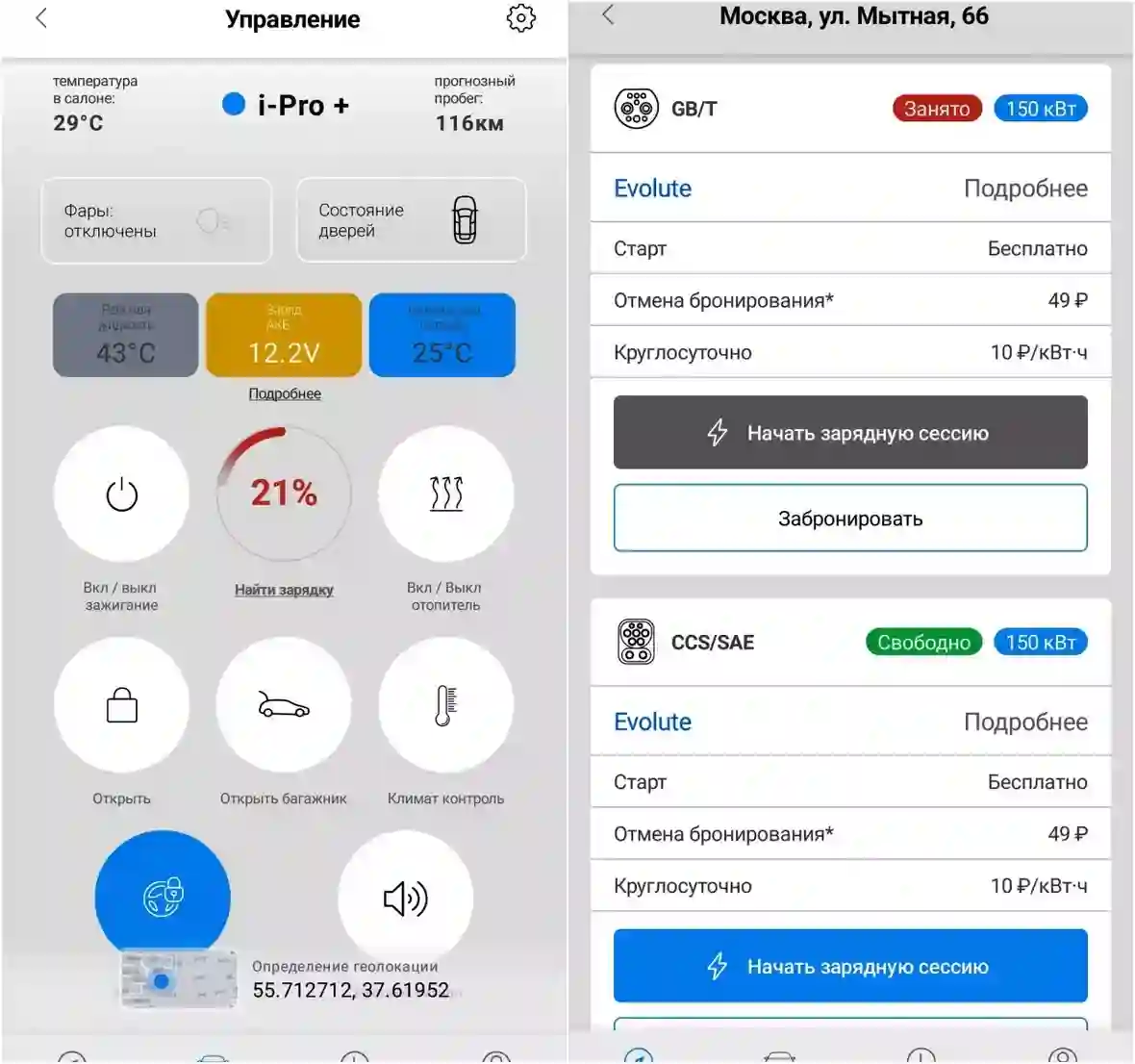 Мобильные приложения для удаленного контроля стали популярными. Для электромобилей их ценность выше: можно управлять процессом зарядки и микроклиматом в салоне. В фирменной сети зарядок EVOLUTE есть редкие пока для России особенности – мощность до 150 кВт и быстрая зарядка для китайского разъема китайский стандарт.