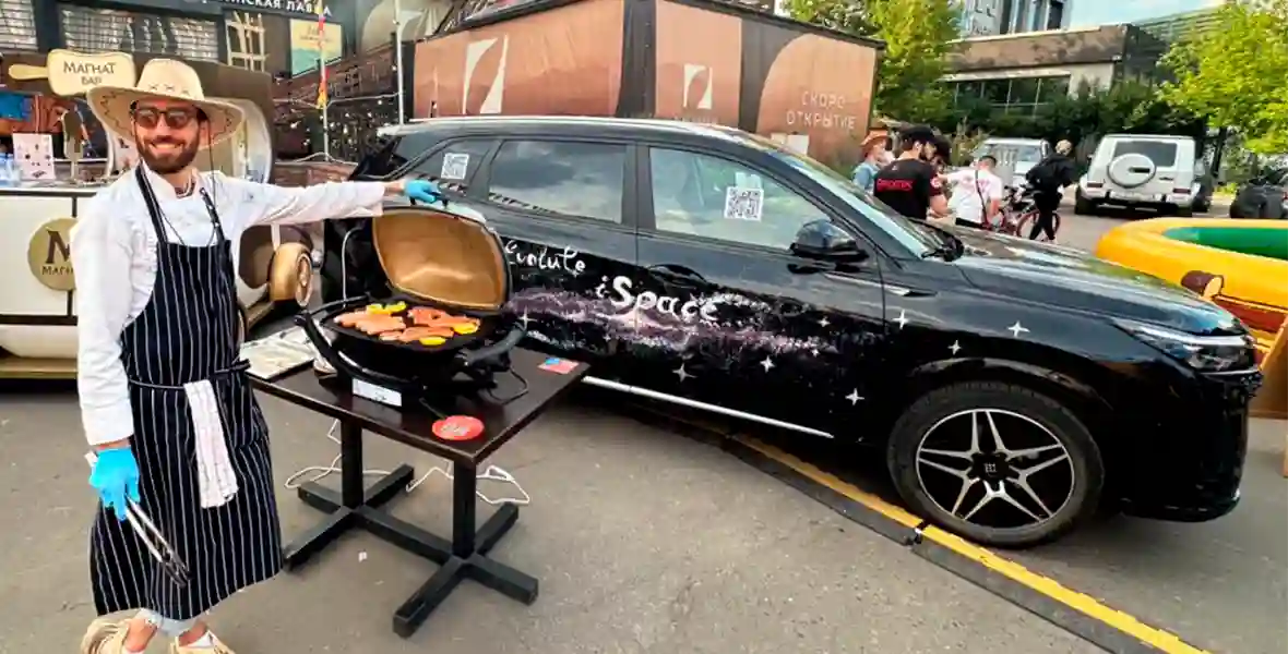 Семиместный гибридный EVOLUTE i‑SPACE стал сердцем кулинарного Гриль-шоу на Усачевском рынке. Кроссовер снабжал энергией электрогриль напрямую от аккумулятора, демонстрируя свою мощность и инновационные возможности.