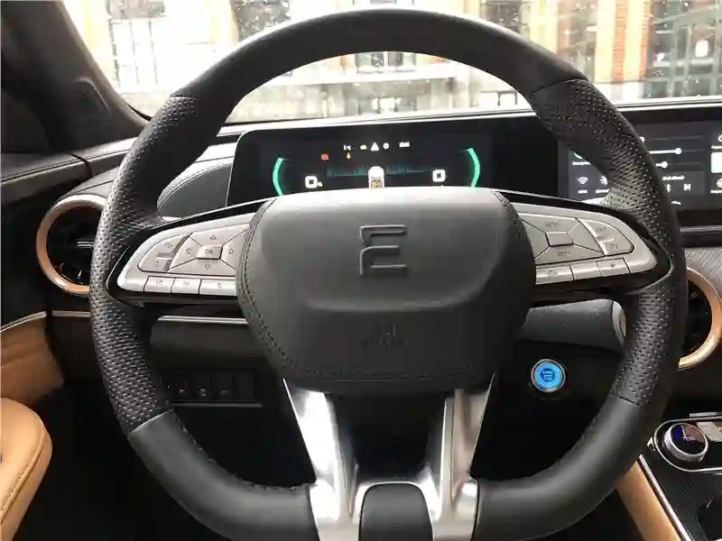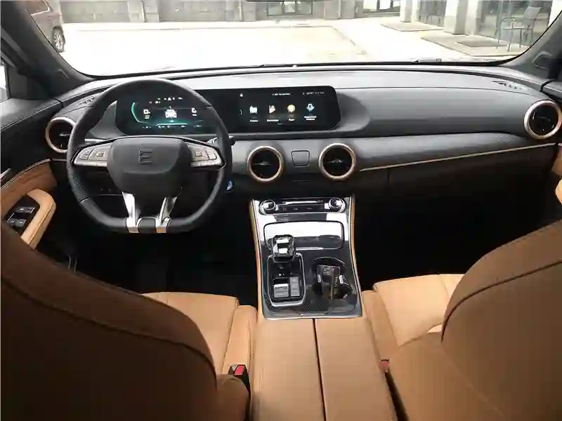 В салоне тестовой машины – сочетание кожзама абрикосового цвета и темного пластика с вставками под алюминий. Материалы недорогие, но благодаря грамотному цветовому сочетанию выглядят дорого. Два одинаковых по размеру экрана, 10,25-дюймовых – приборная панель и экран мультимедиа в центре передней панели. Есть блютус, нет CarPlay и Интеграция со смартфоном, но можно «зеркалить» экран смартфона через приложение Carbitlink. Немного странно смотрится панорамная крыша c эффектом «звездное небо» – днем, когда солнцезащитная шторка открыта. Кажется, к стеклу крыши снаружи прилипло что-то, вроде звездочек от детской хлопушки.