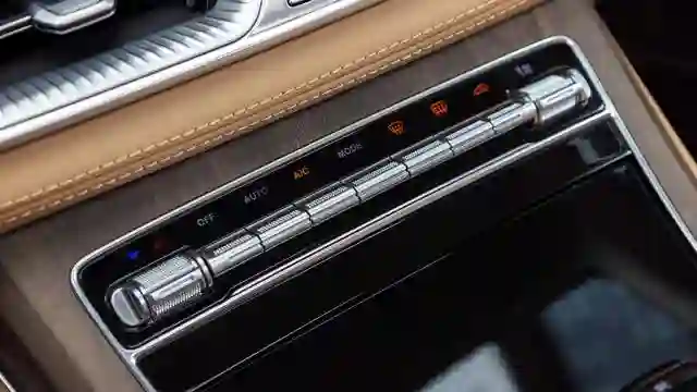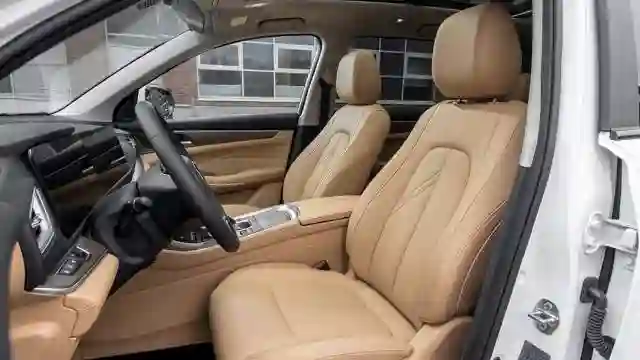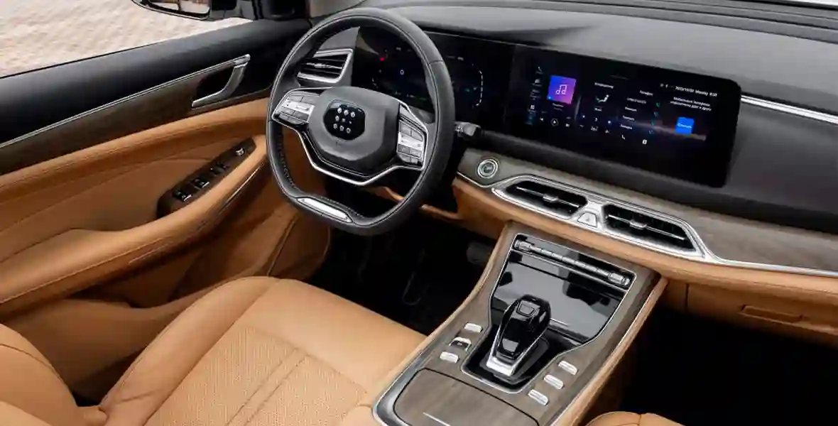 Посадка за рулем вертикальная, как в минивэне, и с минимумом настроек — ни регулировки поясничного подпора, ни возможности изменить наклон подушки. При этом оформление интерьера — с претензией на премиум, причем консервативный. Бежевая кожа, похожая на натуральную, сочетается с солидными вставками под дерево и изящными хромированными деталями. Двухспицевый руль как в Mercedes S-класса 10-летней давности, из той же эпохи упругие физические клавиши, сосредоточенные в нижней части панели. Селектор трансмиссии при этом нефиксируемый, а верх панели занят двумя дисплеями.