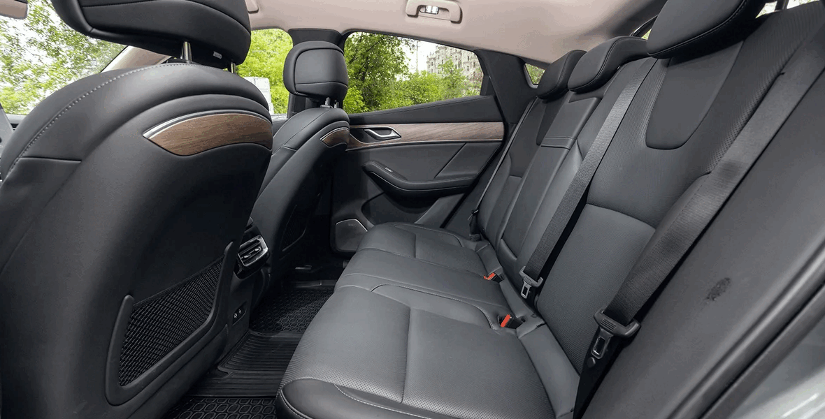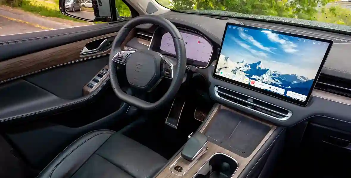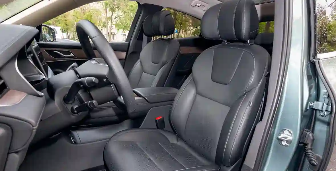 В статике EVOLUTE i‑JET пытается понравиться ещё издалека: водителя встречают скрытые ручки дверей, которые выезжают сами, ощущая присутствие ключа в кармане. На порогах — гордые накладки с названием российского бренда (правда, со следами от клея, неряшливо нанесённого в рамках локализации производства), а сразу за ними — приятный кожзам, декор под дерево и, конечно, два больших экрана.